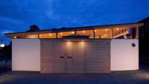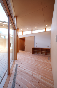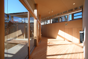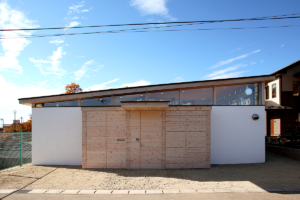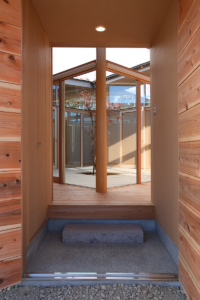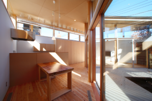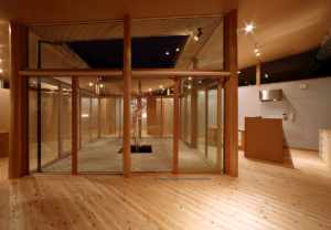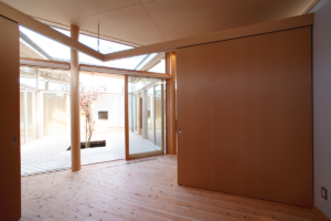 地方都市の郊外、農地から宅地化が進む地域に建つ小住宅である。住まいては、子供たちが独立後の夫婦である。那須高原でペンションを営んでおり、冬場など閑散期に当面はセカンドハウスとして使い、リタイア後の住まいとして考えている。生活の状況から、リビング空間、ダイニングキッチン空間、寝室空間、その他水回り+書斎空間の大きく4つのスペースに分けられると考えた。周辺は変化が激しく、通行量の多い道路が近接していることから、矩形平面に囲み、中央に45°振った正方形の中庭に向けて開くこととした。4つに分節した空間は緩やかにつながって、流動的でありながらそれぞれに重心のある空間となり、住まい手各々が自分の居場所を見分けて、気配を緩んじながら適切な距離を保ちつつ生活できる住まいとしている。